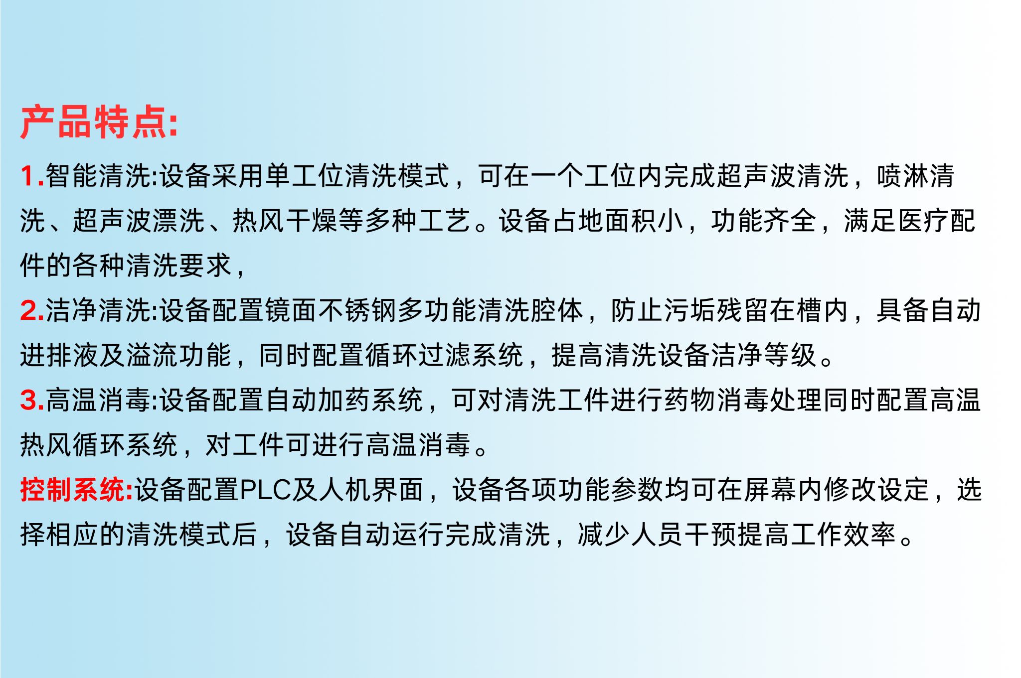 这款医疗器械清洗机专为医疗配件清洗打造,采用单工位模式,于一个工位内集成超声波清洗、喷淋清洗、超声波漂洗及热风干燥等多元工艺,占地小且功能全。其镜面不锈钢多功能清洗腔体,配合自动进排液、溢流及循环过滤系统,有效防止污垢残留,提升洁净等级。同时,自动加药与高温热风循环系统,实现药物与高温双重消毒。通过 PLC 及人机界面,可便捷设定各项功能参数,选择清洗模式后设备自动运行,减少人工干预,极大提高清洗效率与质量,满足医疗行业严苛的清洗消毒要求。